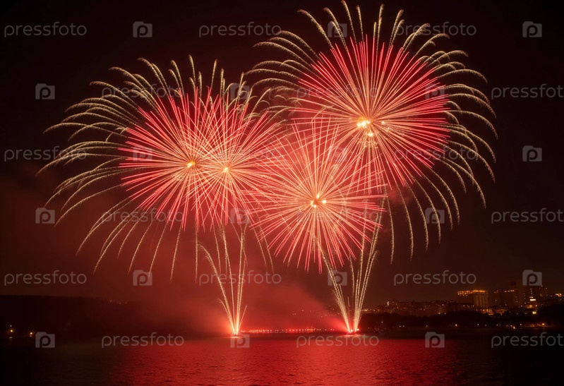 Яркие красные и золотые фейерверки взрываются на фоне темного неба, отражаясь в водном пути. Празднование освещает городской горизонт во время праздничного ночного мероприятия. Генеративный ИИ