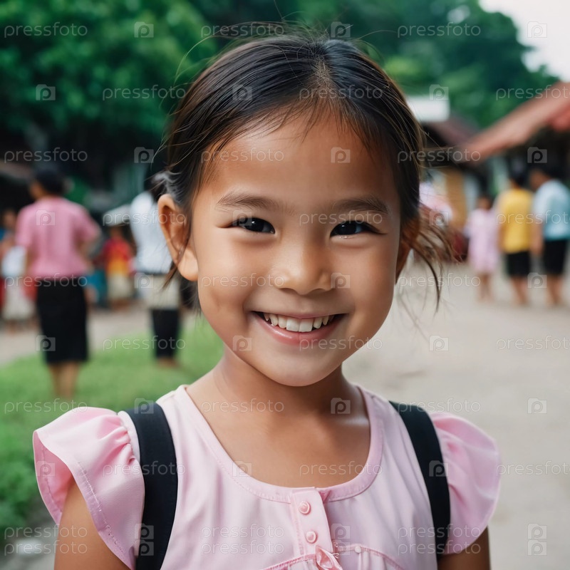 Веселая девочка в Таиланде стоит улыбаясь, окруженная пышной зеленью и людьми на заднем плане. Она олицетворяет радость детства в оживленном районе. Генеративный ИИ