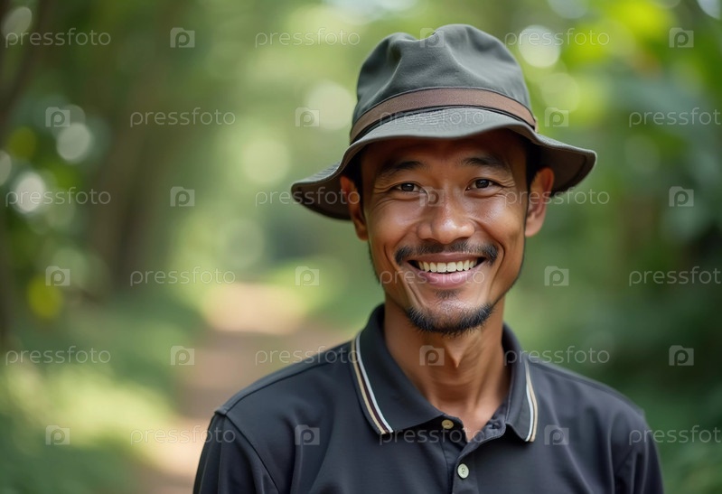 Веселый мужчина в шляпе идет по зеленой тропе в Таиланде, излучая тепло и счастье, наслаждаясь окружающей природой. Генеративный ИИ
