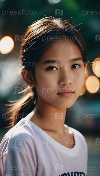 Девушка уверенно стоит на открытом воздухе в Таиланде вечером. Ее спокойное выражение лица отражает мягкое свечение окружающего света на заднем плане, создавая спокойную атмосферу. Генеративный ИИ