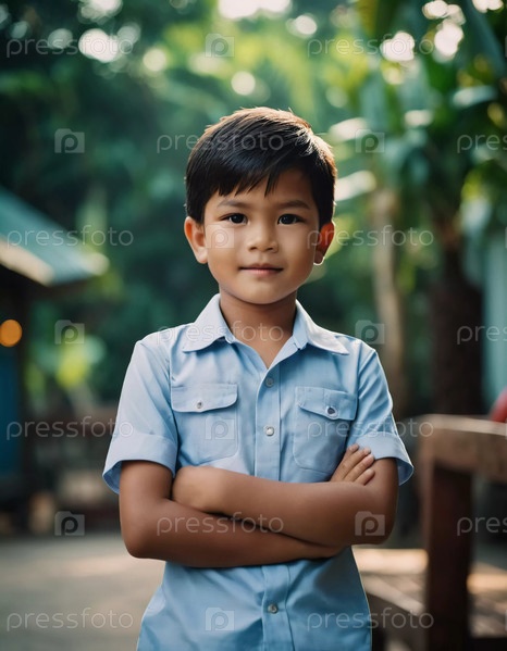Мальчик лет восьми стоит, улыбаясь, скрестив руки на прекрасном открытом воздухе, полном зелени. Генеративный ИИ