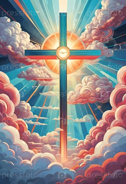 Яркий крест возвышается среди разноцветных облаков, от которых исходят лучистые лучи света, создавая небесную атмосферу в безмятежный момент. Генеративный ИИ