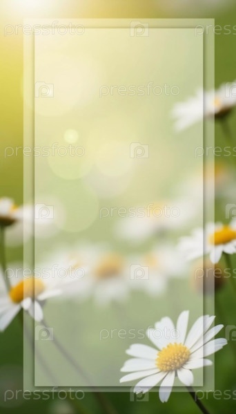 Цветы маргаритки мягко цветут в естественной обстановке, улучшенной прямоугольным полупрозрачным пространством для текста. Солнечный свет создает мягкий эффект боке, добавляя тепла. Аромат, вкус, запах ромашки. Генеративный ИИ