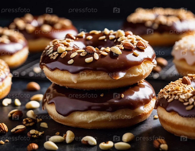Соблазнительная витрина из пончиков, покрытых шоколадной глазурью и украшенных разнообразными орехами, выставлена на деревенском деревянном столе. Теплое освещение подчеркивает вкусные детали и текстуры угощений. Генеративный ИИ