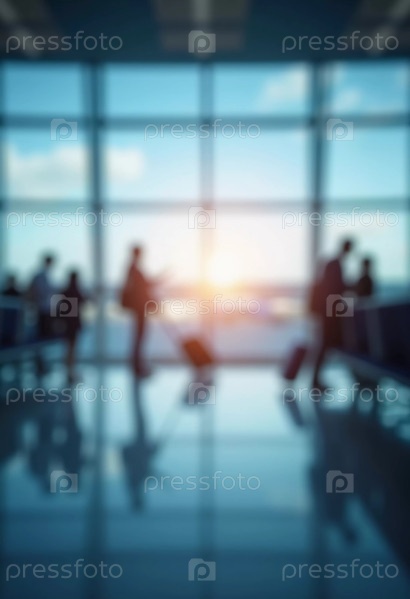 Толпы путешественников перемещаются по просторному терминалу аэропорта, занимаясь различными делами и готовясь к предстоящим рейсам в утреннем или вечернем свете. Расфокусированное боке. Генеративный ИИ