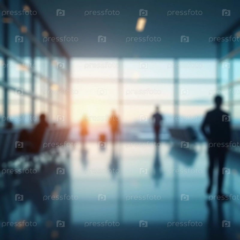 Толпы путешественников перемещаются по просторному терминалу аэропорта, занимаясь различными делами и готовясь к предстоящим рейсам в утреннем или вечернем свете. Расфокусированное боке. Генеративный ИИ