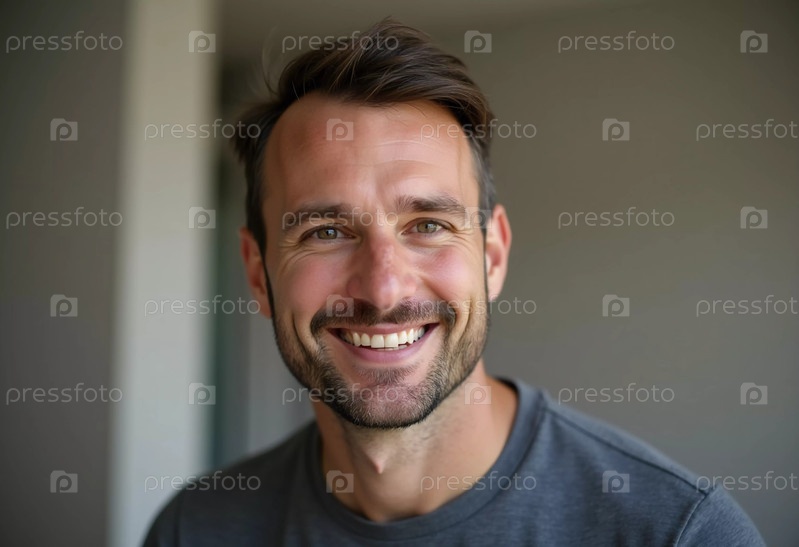 Веселый молодой симпатичный мужчина 30 лет, житель США, с короткими волосами и ухоженной бородой, тепло улыбается, одетый в повседневную одежду. Мягкое освещение усиливает дружескую атмосферу. Генеративный ИИ