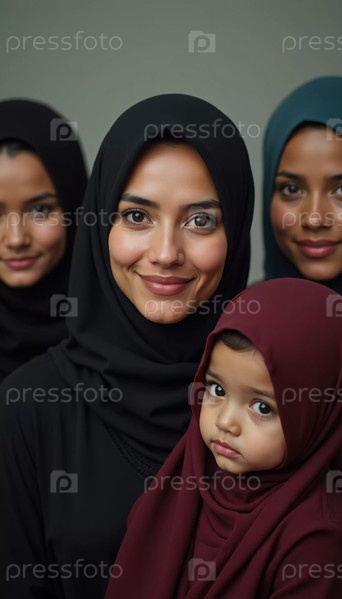 Разнообразная группа мусульманских женщин в красочных хиджабах уверенно стоит вместе. Они делятся улыбками и товариществом, наслаждаясь моментом единения и счастья. Красивые молодые женщины. Генеративный ИИ