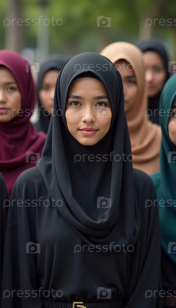 Группа мусульманок в разноцветных хиджабах собралась вместе, демонстрируя свою культурную гордость и индивидуальный стиль. Красивые женщины с азиатскими чертами лица. Уверенный взгляд. Генеративный ИИ