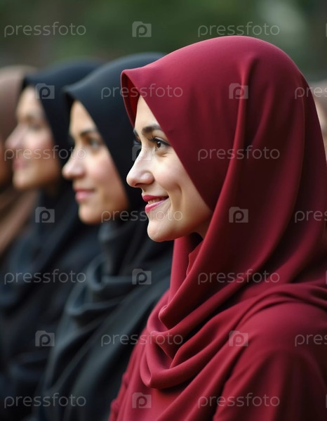 Разнообразная группа мусульманских женщин в красочных хиджабах уверенно стоит вместе. Они делятся улыбками и товариществом, наслаждаясь моментом единения и счастья. Красивые молодые женщины. Генеративный ИИ