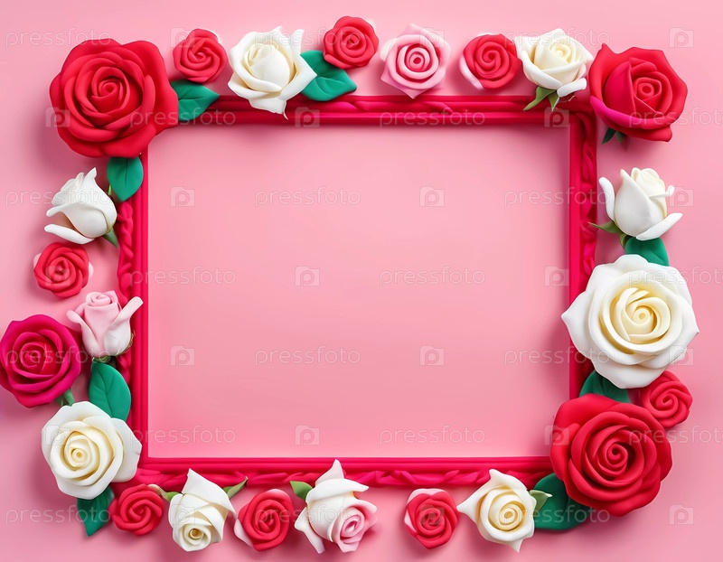 Яркая рамка, украшенная красными, розовыми и белыми розами, расположена на нежно-розовом фоне, предоставляя идеальное место для личных сообщений или дорогих сердцу воспоминаний. Генеративный ИИ