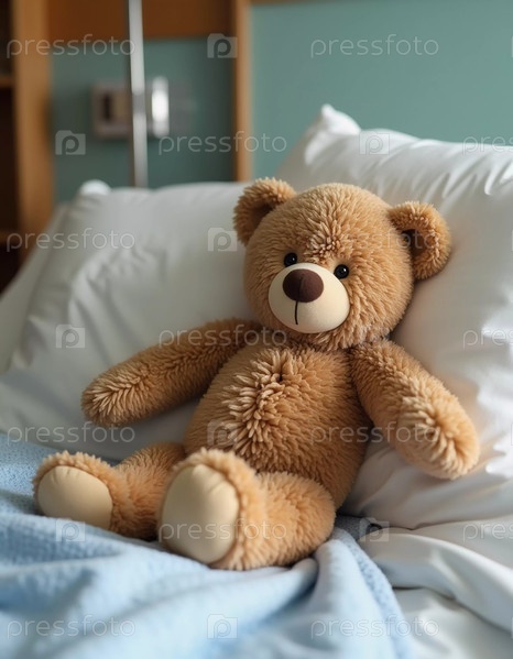Мягкий плюшевый мишка сидит на больничной койке, даря утешение и надежду ребенку, идущему на поправку. Теплые тона мишки контрастируют с безмятежной обстановкой, усиливая атмосферу. Генеративный ИИ