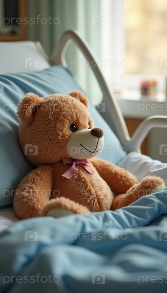Мягкий плюшевый мишка сидит на больничной койке, даря утешение и надежду ребенку, идущему на поправку. Теплые тона мишки контрастируют с безмятежной обстановкой, усиливая атмосферу. Генеративный ИИ