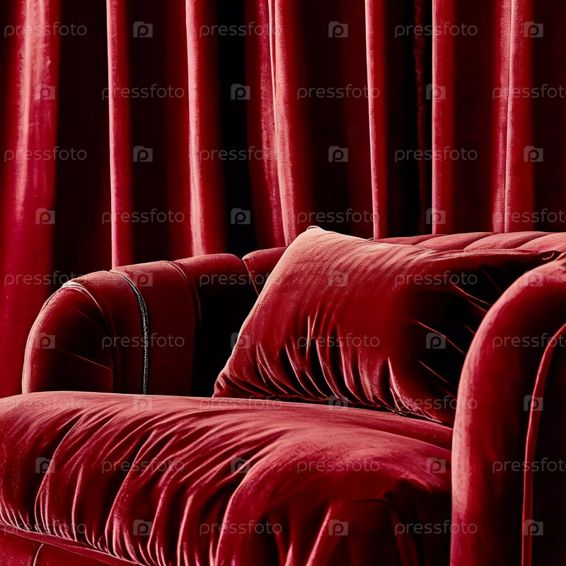 Богатый красный бархатный диван дополняет роскошные занавески, создавая уютную атмосферу в изысканной гостиной. Мягкие ткани источают элегантность и тепло. Генеративный ИИ
