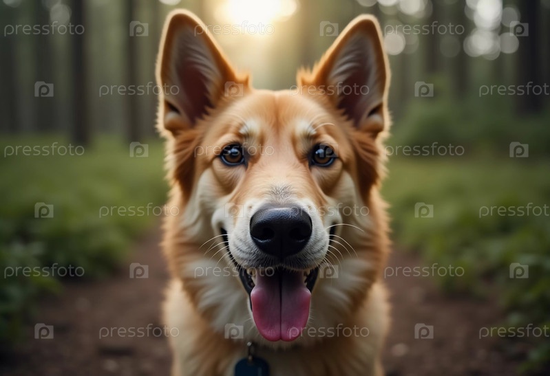 Золотая собака широко улыбается среди пышной зелени в тихом лесу, греясь в солнечных лучах, пробивающихся сквозь высокие деревья. Природа расцветает вокруг, наслаждаясь этим мирным моментом AI