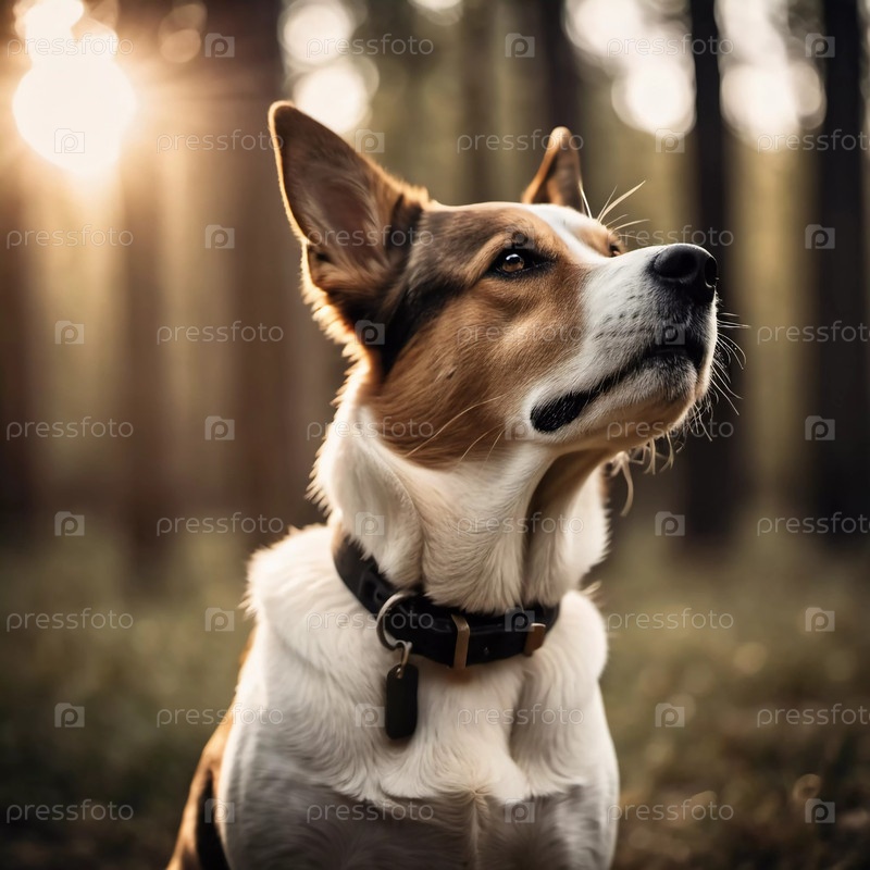 Любопытная собака стоит в безмятежном лесу, окруженная высокими деревьями и пятнистым солнечным светом. Ее шерсть блестит в теплом сиянии, воплощая чувство приключения и покоя в природе AI