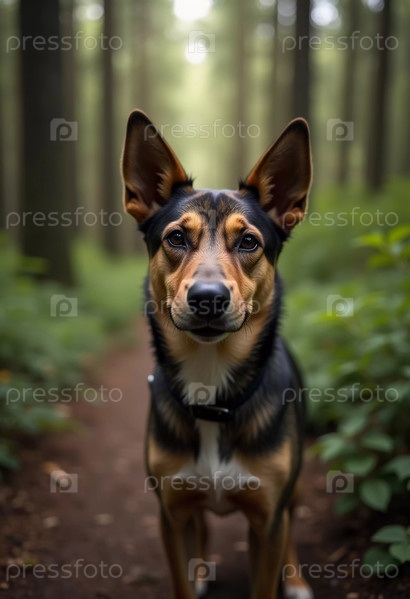 Любопытная собака стоит на лесной тропе, окруженной возвышающимися деревьями и яркой зеленью. Мягкий свет просачивается сквозь листву, создавая спокойную атмосферу, идеально подходящую для исследования AI