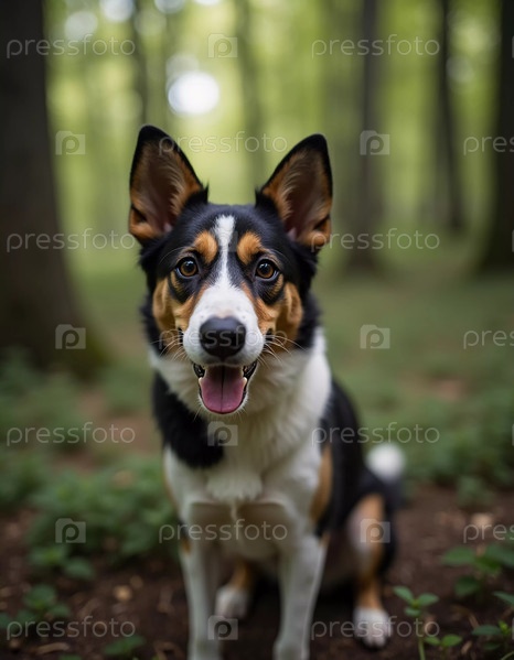 В тихом лесу среди яркой зелени сидит веселая собака с яркими отметинами