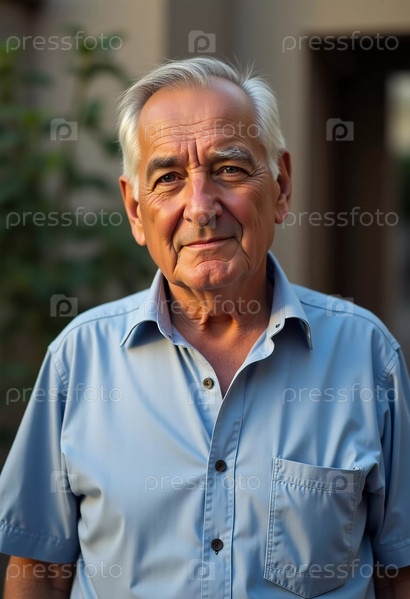 Пожилой мужчина стоит уверенно с мягкой улыбкой, одетый в светло-голубую рубашку. Он излучает мудрость и тепло, наслаждаясь яркой атмосферой своего окружения