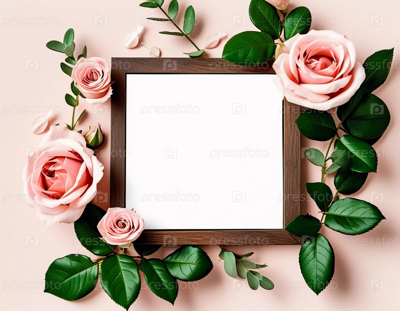 Мягкие розовые розы окружают пустое пространство, приглашая креативность и индивидуальный подход. Свежая зелень усиливает композицию, идеально подходит для открыток или особых моментов Генеративный ИИ