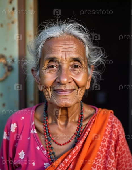 Пожилая индийская женщина тепло улыбается, одетая в красочное сари, украшенное замысловатыми узорами Генеративный ИИ