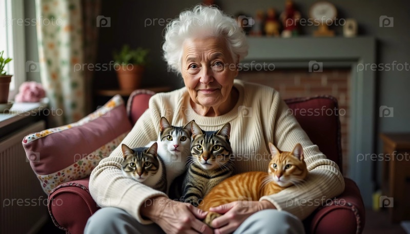 Веселая бабушка удобно расположилась в уютном кресле, держа на руках трех очаровательных котов и наслаждаясь мирным моментом в помещении. Солнечный свет проникает сквозь занавески Генеративный ИИ