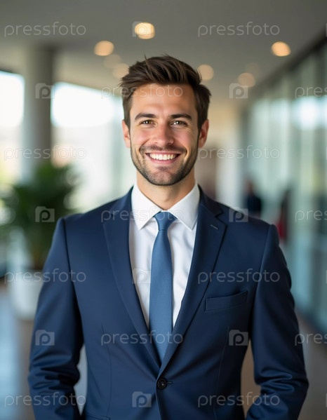 Молодой человек, одетый в стильный деловой костюм, излучает уверенность в себе в элегантной офисной обстановке, окруженной элегантной архитектурой и мягким освещением, создающим гостеприимную атмосферу. Генеративный искусственный интеллект
