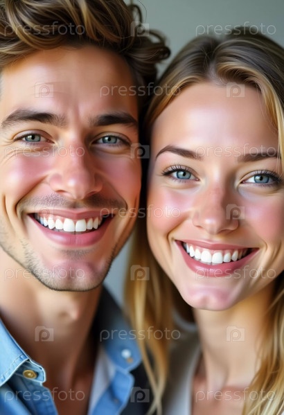 В теплой и уютной атмосфере молодая пара стоит рядом друг с другом, сияя яркими улыбками, демонстрирующими их счастье и единение. Генеративный искусственный интеллект