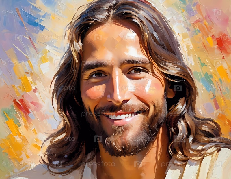 В яркой и красочной обстановке радостное изображение Иисуса Христа сияет теплой улыбкой. Художественный фон усиливает его послание любви и надежды всем, кто его встречает. Генеративный ИИ