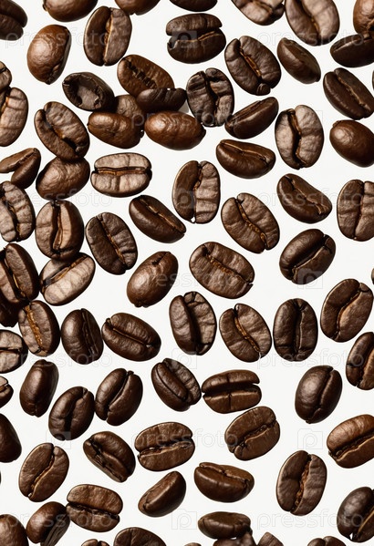 Захватывающая композиция из кофейных зерен, разбросанных по белому фону, демонстрирует их глянцевую поверхность и сложные детали Генеративный искусственный интеллект