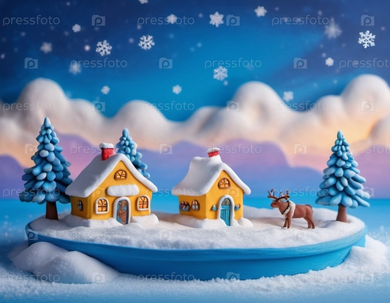 Причудливая деревня, пряничный домик, заснеженные крыши, окна и дымоход. Дом окружен снегом и снежинками. Синий фон с эффектом боке. Праздничная и очаровательная зимняя страна чудес. Генерация ИИ