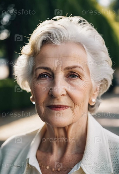 Утонченная пожилая француженка на открытом воздухе. Манера поведения раскрывает жизненный опыт и размышления, воплощая изящество и мудрость. Ухоженная женщина 70 лет с седыми волосами. AI