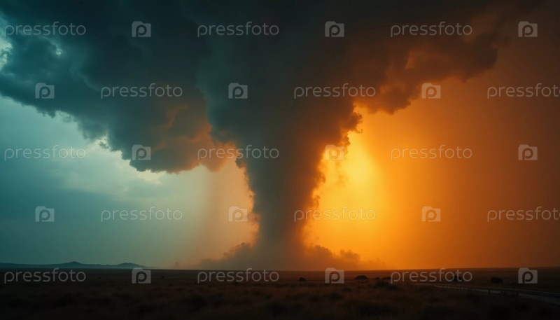 Темные грозовые облака зловеще закручиваются, когда надвигается мощный торнадо, объединяющий драматические молнии и огненное небо, вселяя страх и благоговение на фоне огромного ландшафта. Генеративный ИИ