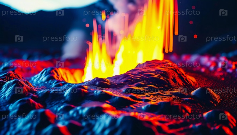Расплавленная магма извергается из вулкана, освещая темный ландшафт яркими цветами, а облака пепла кружатся над головой, демонстрируя потрясающую мощь природы. Генеративный ИИ