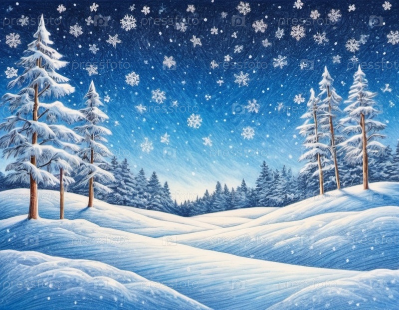 Живописная зимняя сцена с заснеженной равниной и силуэтами деревьев на фоне яркого ночного неба. Мягкий снегопад добавляет волшебный штрих, создавая спокойный и захватывающий дух пейзаж. Сгенерированный ИИ