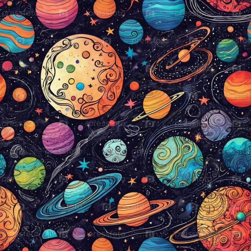 Планетарная система с несколькими планетами, большим ярко окрашенным газовым гигантом и каменистой планетой. Яркие звезды и огромное пространство темного космоса с галактикой на заднем плане. Космические просторы. Космонавтика. ИИ