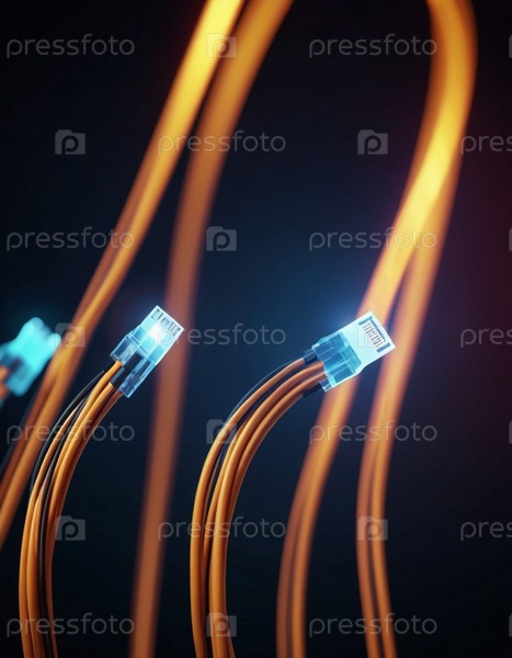 Синие и оранжевые светящиеся провода скручиваются и переплетаются на темном фоне с боке-огнями. Черные кабели и разъемы со светящимися огнями и цепями соединяются, образуя сеть. Создано с помощью ИИ