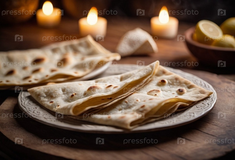 Свежеиспеченная лепешка из лаваша элегантно лежит на деревенской деревянной доске, демонстрируя свою мягкую текстуру и золотисто-коричневые пятна. Теплый огонь потрескивает в очаге, отбрасывая уютное сияние на сцену. Лепешка AI