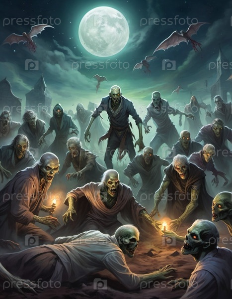 Гротескные зомби появляются из могил, разложившиеся тела освещаются лунным светом. Скелетные фигуры бродят среди надгробий, в то время как другие ползают по земле, демонстрируя свой ужасный вид. ИИ
