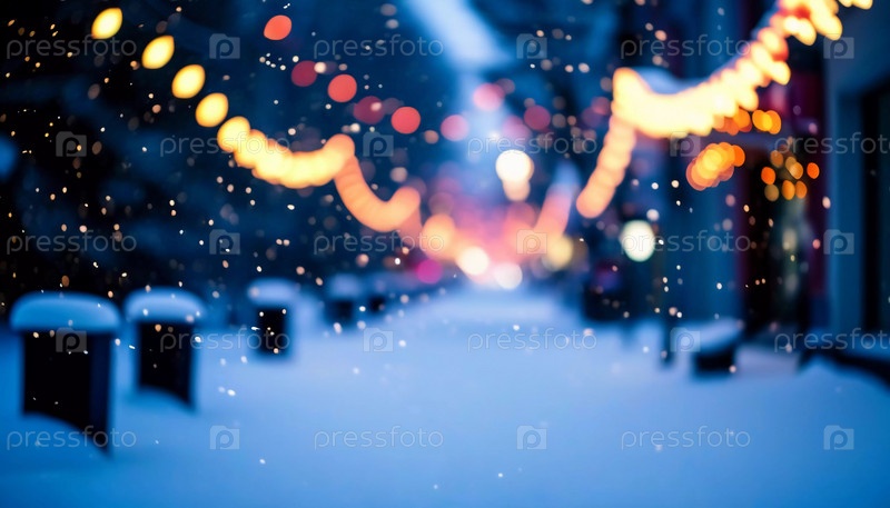 Зима приносит мягкий снегопад на городские улицы, где разноцветные огни висят над головой, создавая теплую и праздничную атмосферу. Эффект боке от огней добавляет причудливый штрих, подчеркивая радость сезона