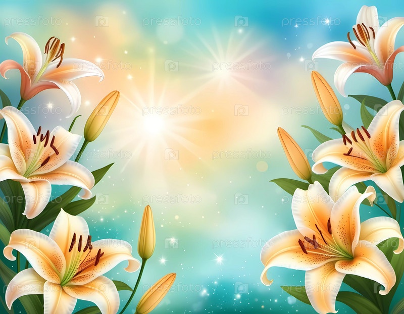 Нежные белые, желтые, оранжевые лилии широко распускают лепестки, обрамленные светящимся сине-зеленым фоном, с мягкими бликами боке и теплыми солнечными лучами, создающими чарующую атмосферу. Генеративный ИИ