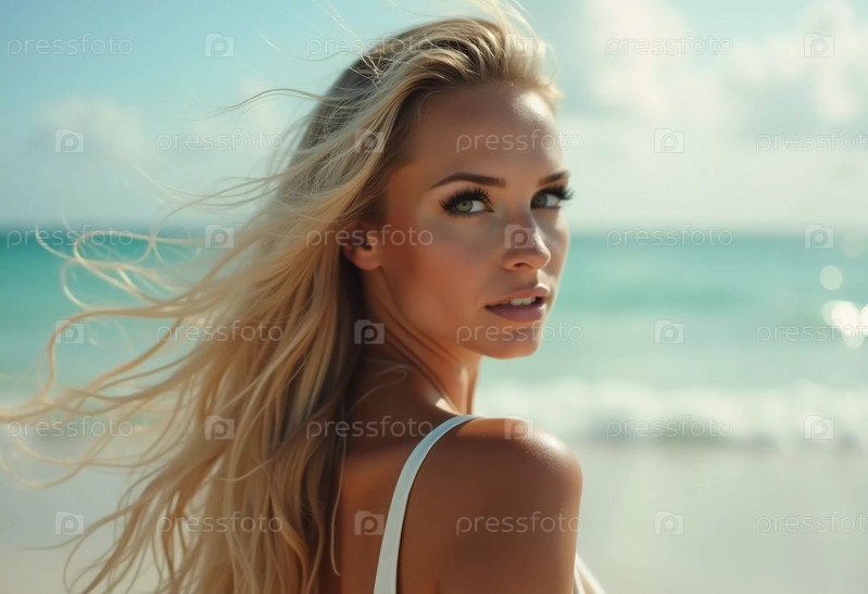 Блондинка в купальнике смотрит назад, стоя у береговой линии. Нежные морские волны плещутся у ее ног под ясным голубым небом. Длинные волосы, красивое молодое лицо. Реклама путешествий и одежды. AI