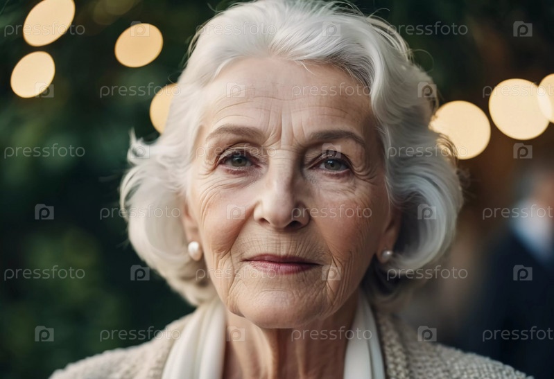 Утонченная пожилая француженка на открытом воздухе. Манера поведения раскрывает жизненный опыт и размышления, воплощая изящество и мудрость. Ухоженная женщина 70 лет с седыми волосами. AI