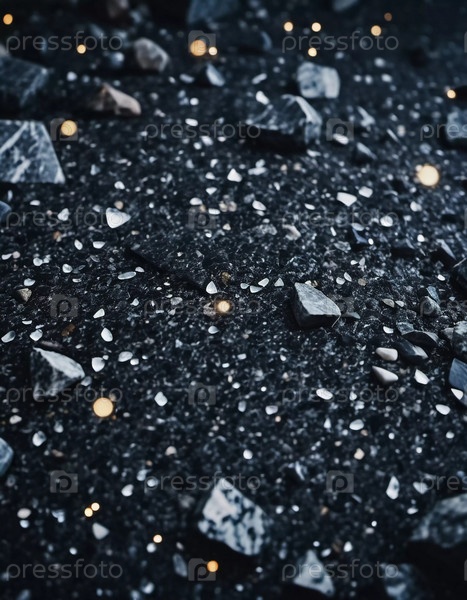 Сложные узоры из темной гранитной крошки, освещенные тонким светом, создающим спокойную и элегантную атмосферу. Черный измельченный минерал сверкает. Боке или капли. Генеративный ИИ