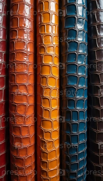 Различные образцы натуральной крокодиловой кожи представлены в ярких цветах. Каждый экземпляр демонстрирует уникальные текстуры и отделки, привлекательные для любителей кожи и дизайнеров. Генеративный ИИ