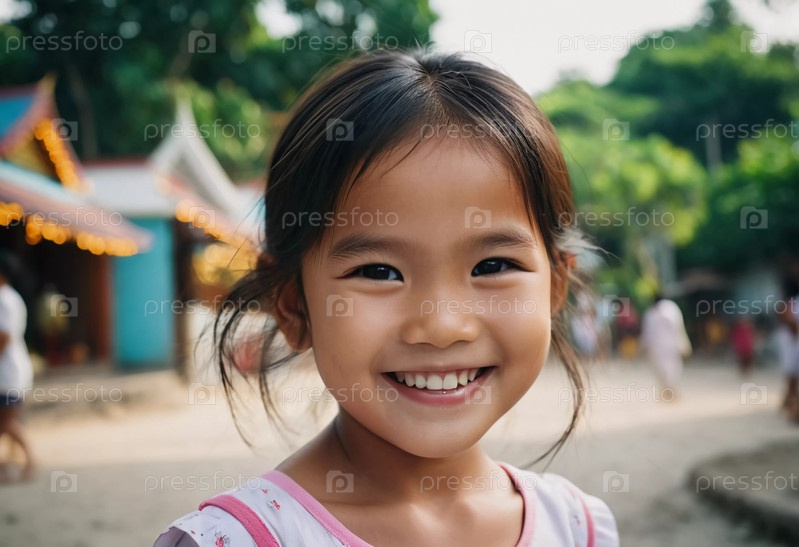 Радостная девушка с темными волосами широко улыбается в оживленной тайской деревне. Окруженная зеленью и традиционной архитектурой, она воплощает счастье и невинность. Генеративный ИИ