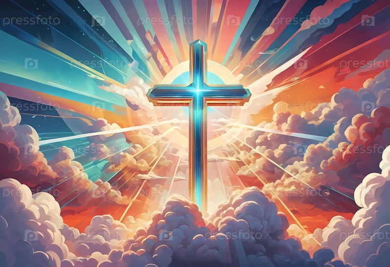 Яркий крест возвышается среди разноцветных облаков, от которых исходят лучистые лучи света, создавая небесную атмосферу в безмятежный момент. Генеративный ИИ