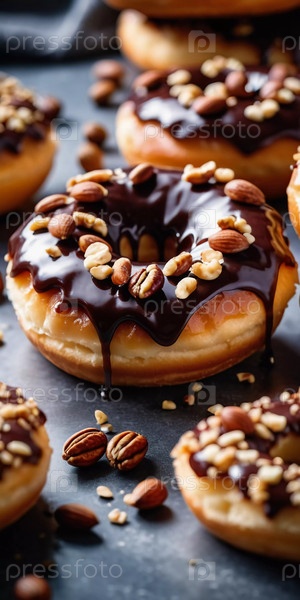 Соблазнительная витрина из пончиков, покрытых шоколадной глазурью и украшенных разнообразными орехами, выставлена на деревенском деревянном столе. Теплое освещение подчеркивает вкусные детали и текстуры угощений. Генеративный ИИ