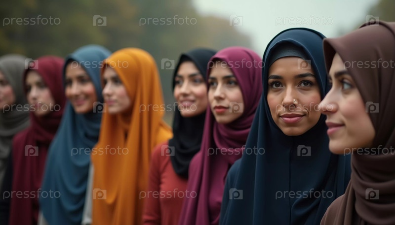 Разнообразная группа мусульманских женщин в красочных хиджабах уверенно стоит вместе. Они делятся улыбками и товариществом, наслаждаясь моментом единения и счастья. Красивые молодые женщины. Генеративный ИИ