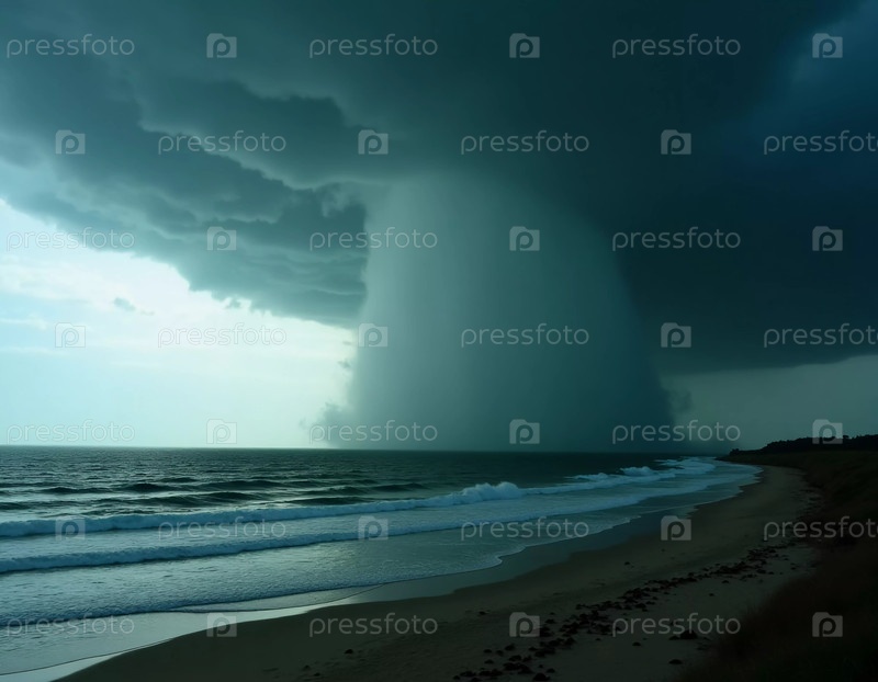 Темные грозовые тучи зловеще нависают над океаном, намекая на мощный циклон, формирующийся вдалеке, в то время как волны мягко омывают песчаный пляж, создавая резкий контраст. Генеративный ИИ